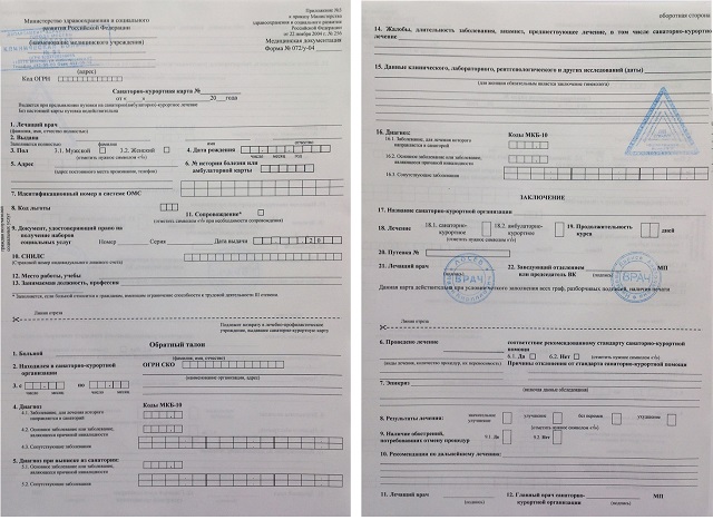 Санаторно-курортная карта - фиксирует отсутствие противопоказаний для санаторно-курортного лечения. В ней засвидетельствованы данные об объективном состоянии больного, о результатах лечения и исследований. Данная справка подтверждает, в первую очередь, отсутствие противопоказаний у больного. Без неё пациента просто не имеют право принять в оздоровительное учреждение.
